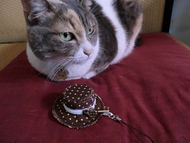 さて昨日予告しました三毛猫みーちゃんにハット型ポーチを乗っけた画像を今日はアップしたいと思います。