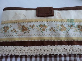 一番下は茶色のチェック、次にアイボリーのレース、その上は黄色の小さなバラ模様の生地を使いました。
