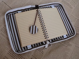ファスナーのついた側面は内側と同じボーダー柄を使い、本の側面をイメージしています☆